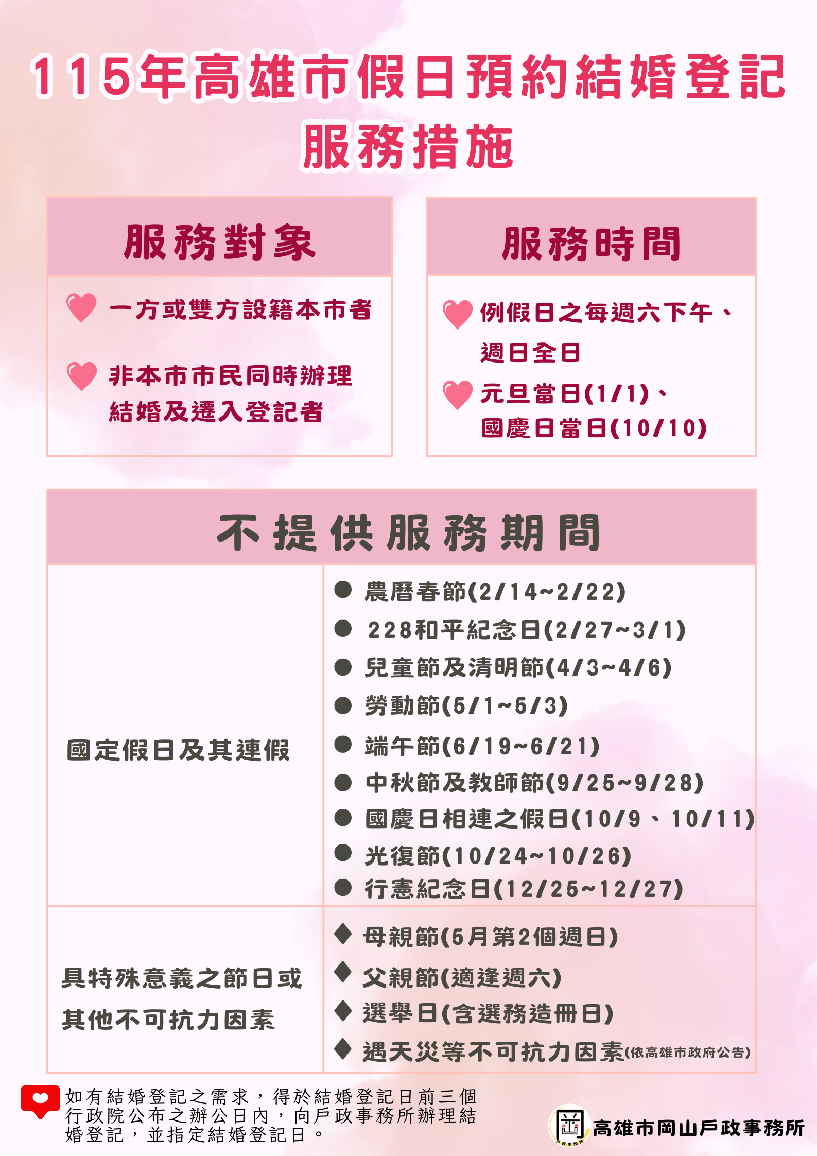 💖若有結婚登記需求,結婚雙方當事人得於結婚登記日前三個行政院公布之辦公日內,向戶政事務所辦理結婚登記,並指定結婚登記日。